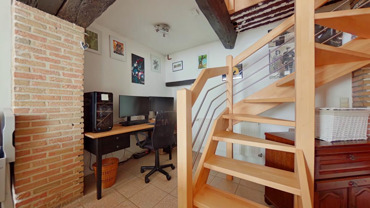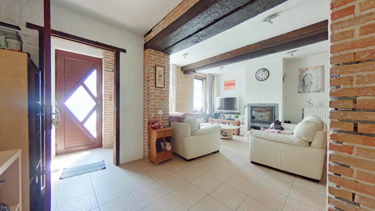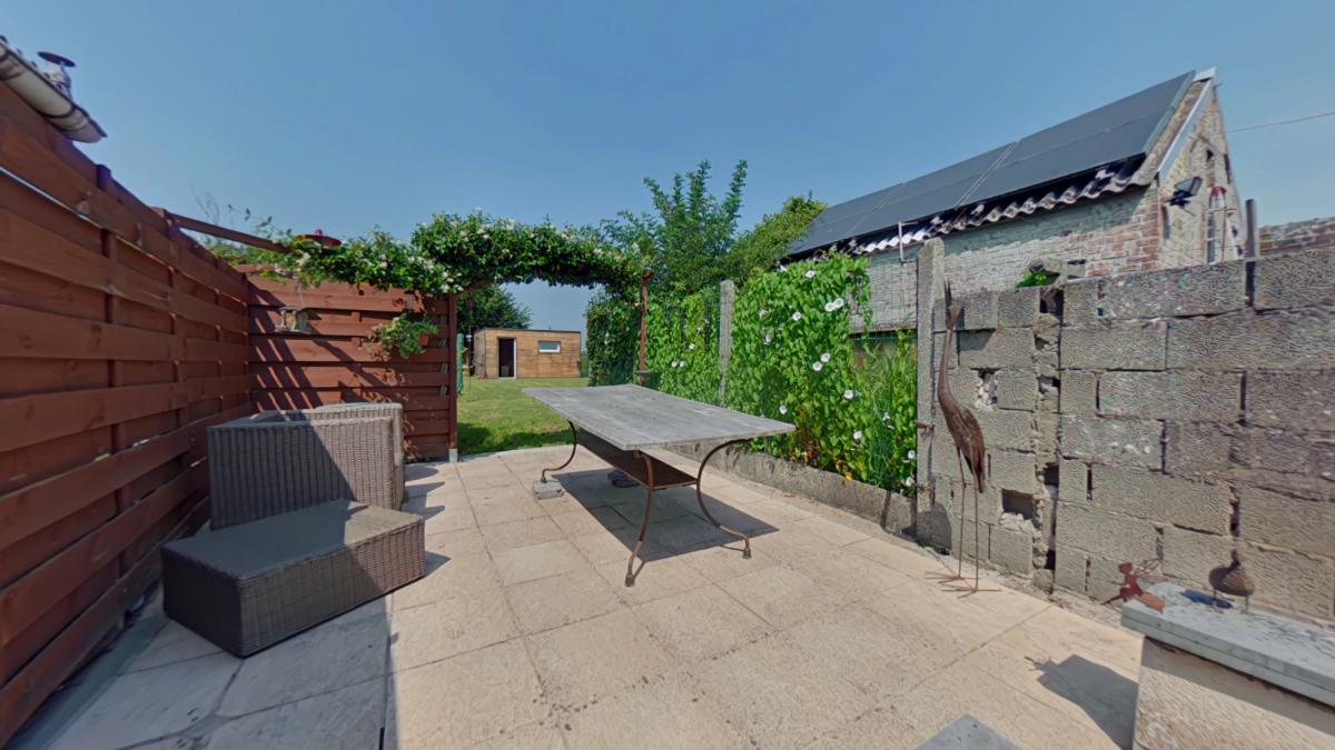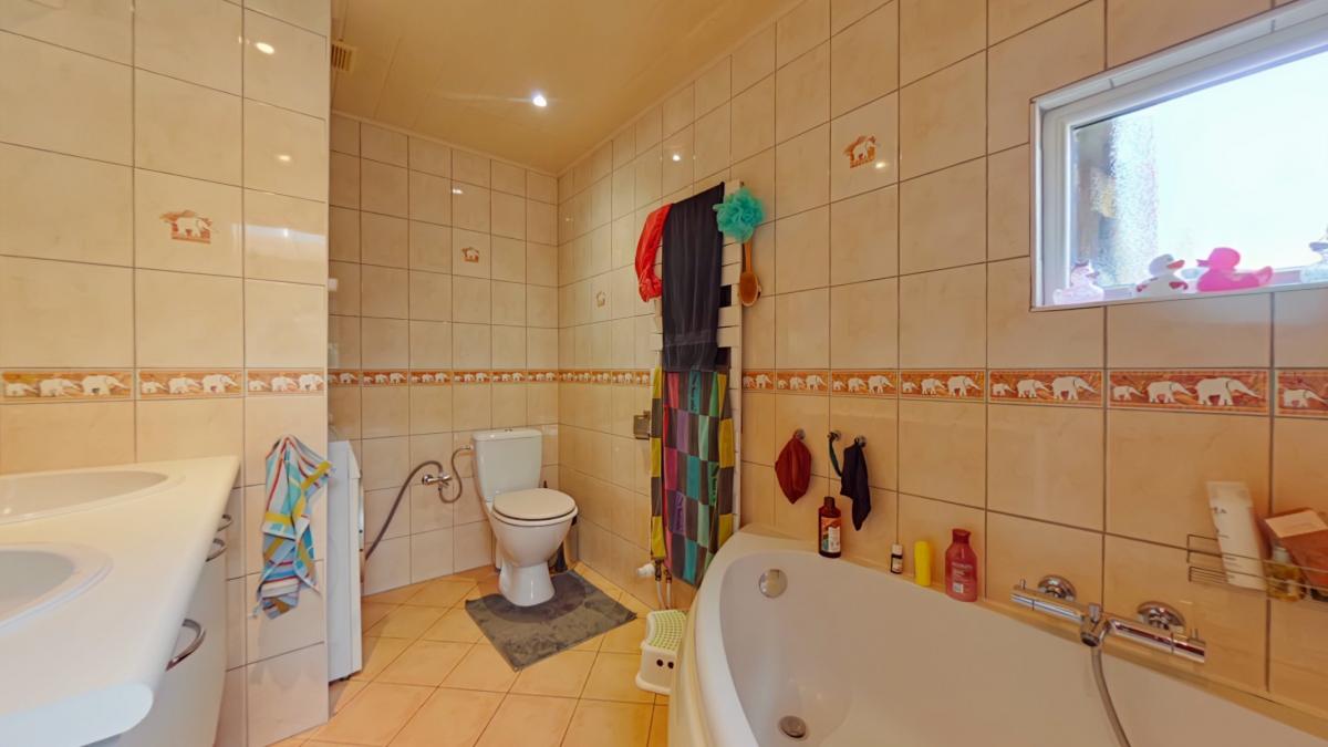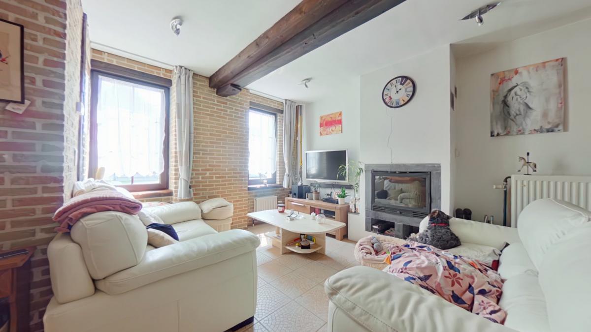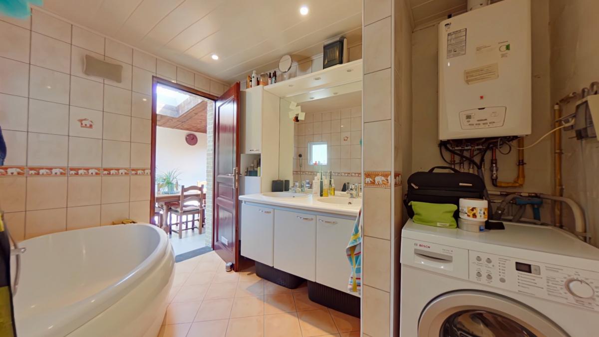 Un sas d'entrée de 1,75 m² (1,75 x 1) Une première pièce de 6,19 m² (2,27 x 2,72) Un salon de 13,32 m² (3,30 x 4,02) Un espace bureau avec escalier vers l'étage d'environ 8 m² (1,98 x 3,43) Un petit hall vers la salle à manger de 4,5 m² Une salle à manger de 11,25 m² (4,98 x 2,25) Une cuisine ouverte sur la salle à manger de 8 m² (2,89 x 2,65), équipée avec : -->évier avec égouttoir et mitigeur -->four ZANUSSI -->taque vitrocéramique -->hotte ZANUSSI ->lave-vaisselle très récent AEG -->meubles en bois Une salle de bain de 6,14 m² (3,02 x 2,03), équipée avec : -->WC --> meuble avec deux lavabos, miroir et colonne de rangement -->baignoire d'angle --> espace pour machine à laver ________________ ETAGE Une première chambre de 16,5 m² habitables (3,41 x 4,86), soit 23 m² au sol (6,77 x 3,41) Une deuxième chambre communicante de 9 m² habitables (1,97 x 4,54), soit 13,25 m² au sol (6,74 x 1,97), avec espace de rangement en mezzanine __________________ AUTRES __________________ Une belle terrasse de 25 m² Un jardin clôturé exposé nord-ouest avec chalet de rangement _________________ INFORMATIONS COMPLEMENTAIRES __________________ Parcelle cadastrée à Lessines, 2ᵉ division, section A, n° 567f Superficie du terrain : 2 ares 60 centiares Le bien est situé en zone d’habitat au plan de secteur Il n’est pas situé en zone inondable Banque de données de l’état des sols : rien à signaler Le bien est relié à l’égout Revenu cadastral non indexé total : 237 €