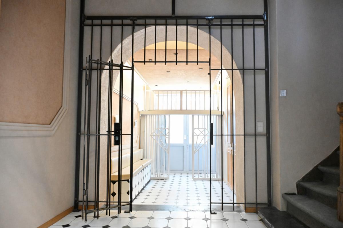 - Hall d’entrée de 15 m² (5,49 x 2,72 m), avec portail en acier sécurisé par code.