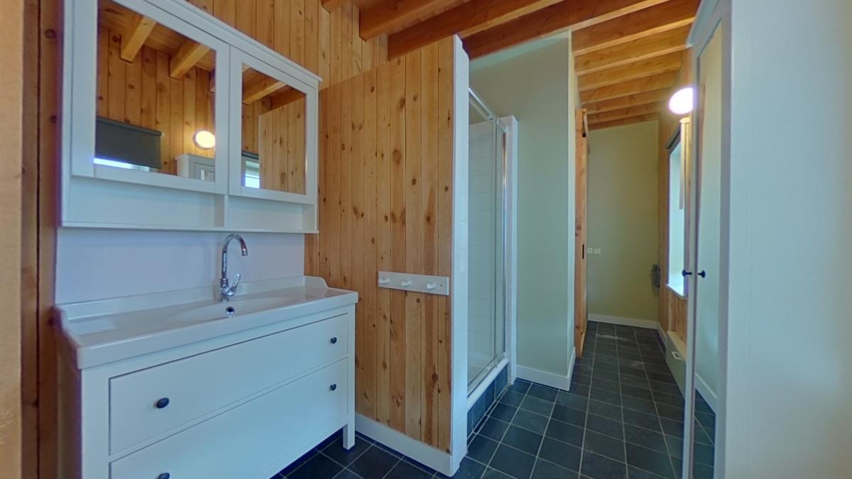 Une salle de bain de 9,5 m² comprenant : - un lavabo avec meuble de rangement. - un meuble pour mannes à linge - un meuble pharmacie à porte miroir - une douche - un WC - les raccordements pour machine à laver et sèche linge